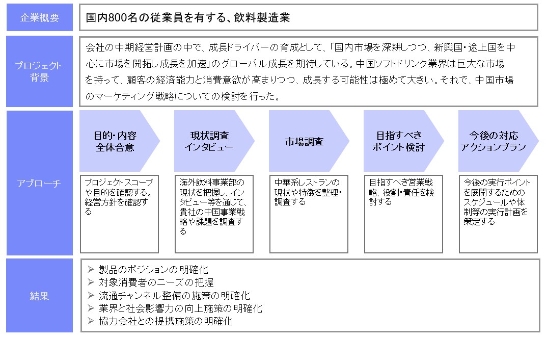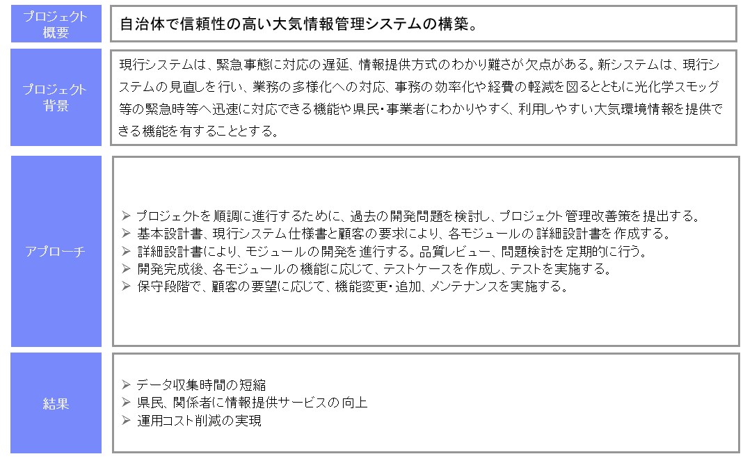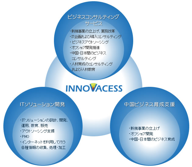 | 事業内容 | 1、新規事業の立上げ、業務改革等のビジネスコンサルティング 2、IT事業に関する企画および導入のコンサルティング 3、ビジネスアウトソーシングのコンサルティングおよび支援 4、情報システム等のオフショア開発推進に関わるコンサルティング及び支援 5、中国、日本間のビジネスコンサルティング 6、人材育成のコンサルティングおよび人材教育 7、IT事業に関するソリューションの設計、開発、運用、教育、販売、アウトソーシング支援 8、インターネットを利用して行う各種情報の収集、処理・加工、及び提供サービス並びに電子商取引に関する仲介業 9、コンピューター技術者等の派遣事業 10、省エネルギーおよび環境保全に関連する製品等の輸出・輸入 |